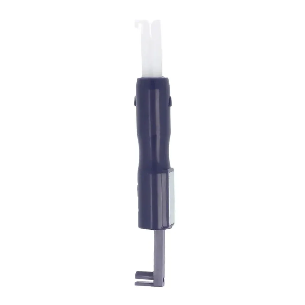 - Magneet (zilverkleurig): in het paarse deel van de tool zit een magneetje waarmee gevallen naalden en spelden in een handomdraai kunnen worden opgepakt.