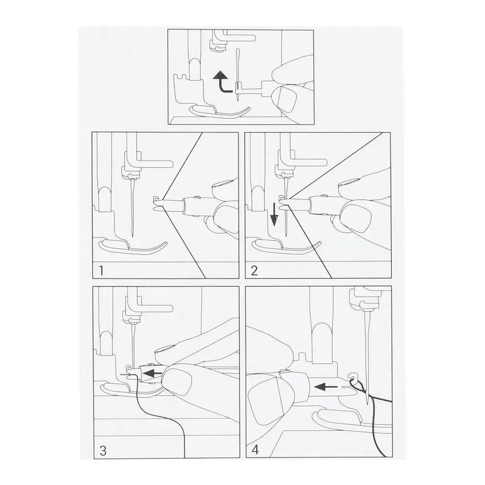 - Draaddoorhaler (witte kant): laat de naaivoet van de naaimachine zakken en zorg dat de naald op de hoogste stand staat. Houd de draaddoorhaler zo vast dat het haakje en pijltje zich aan de bovenkant bevinden en leg de draad tussen de horizontale sleuf. Zet de draaddoorhaler in een rechte hoek tegen de naald, laat de tool langzaam langs de naald omlaagglijden en oefen daarbij lichte druk uit. Zodra het oog wordt bereikt, drukt een metalen pinnetje de draad door het oog. Verwijder de pin voorzichtig uit het oog en haal tot slot het haakje door de lus en trek het draadeind door het oog.